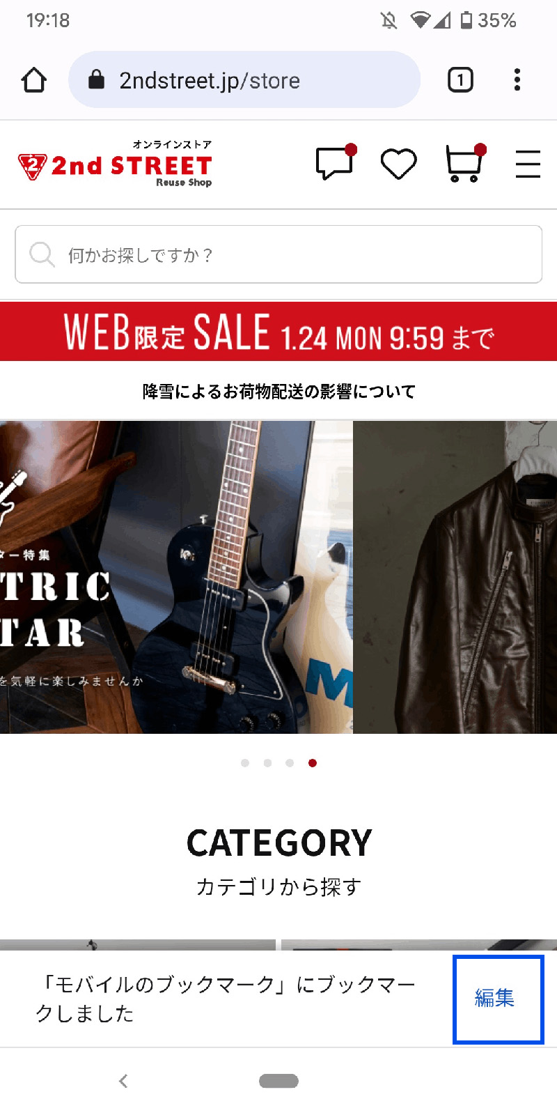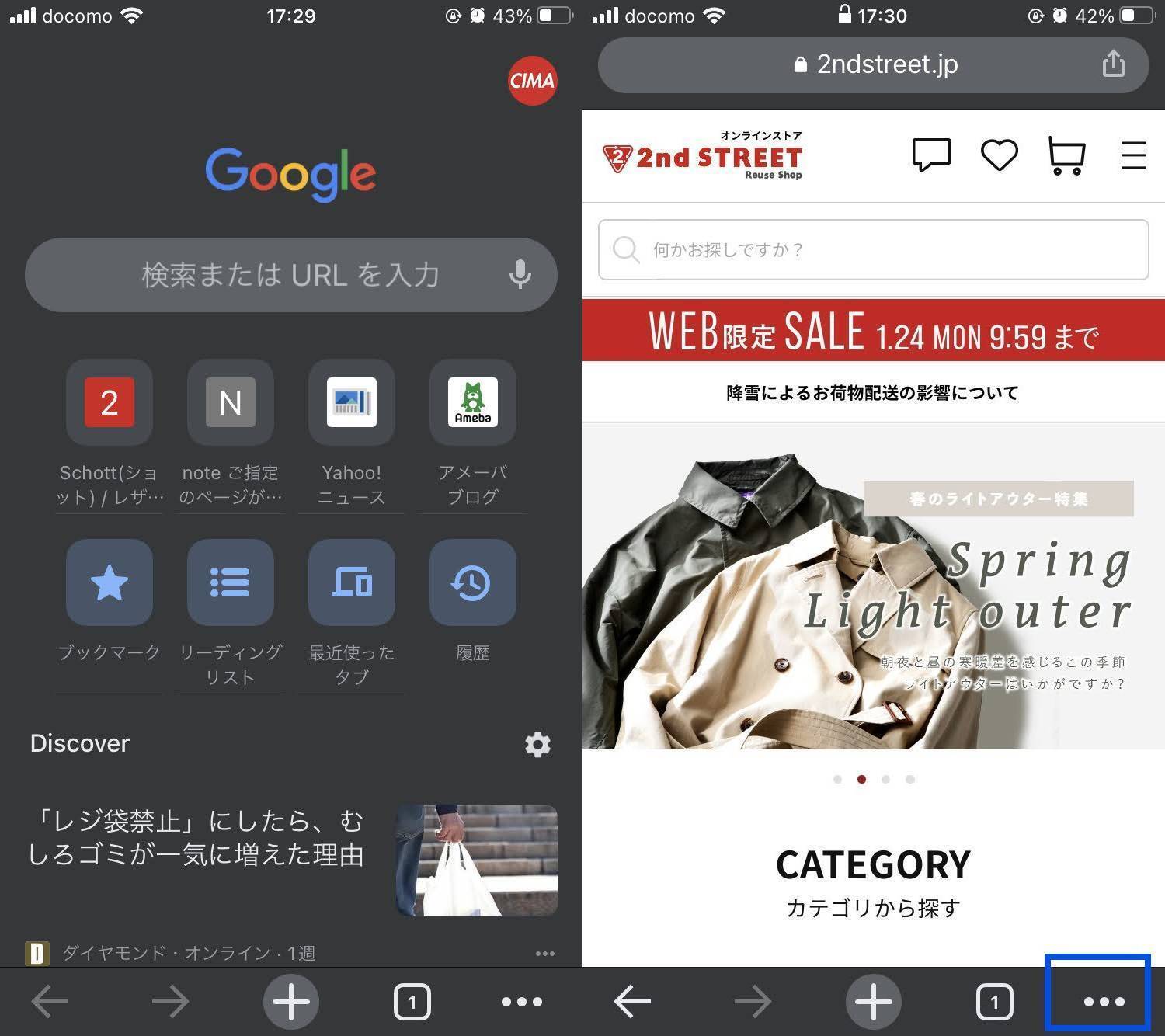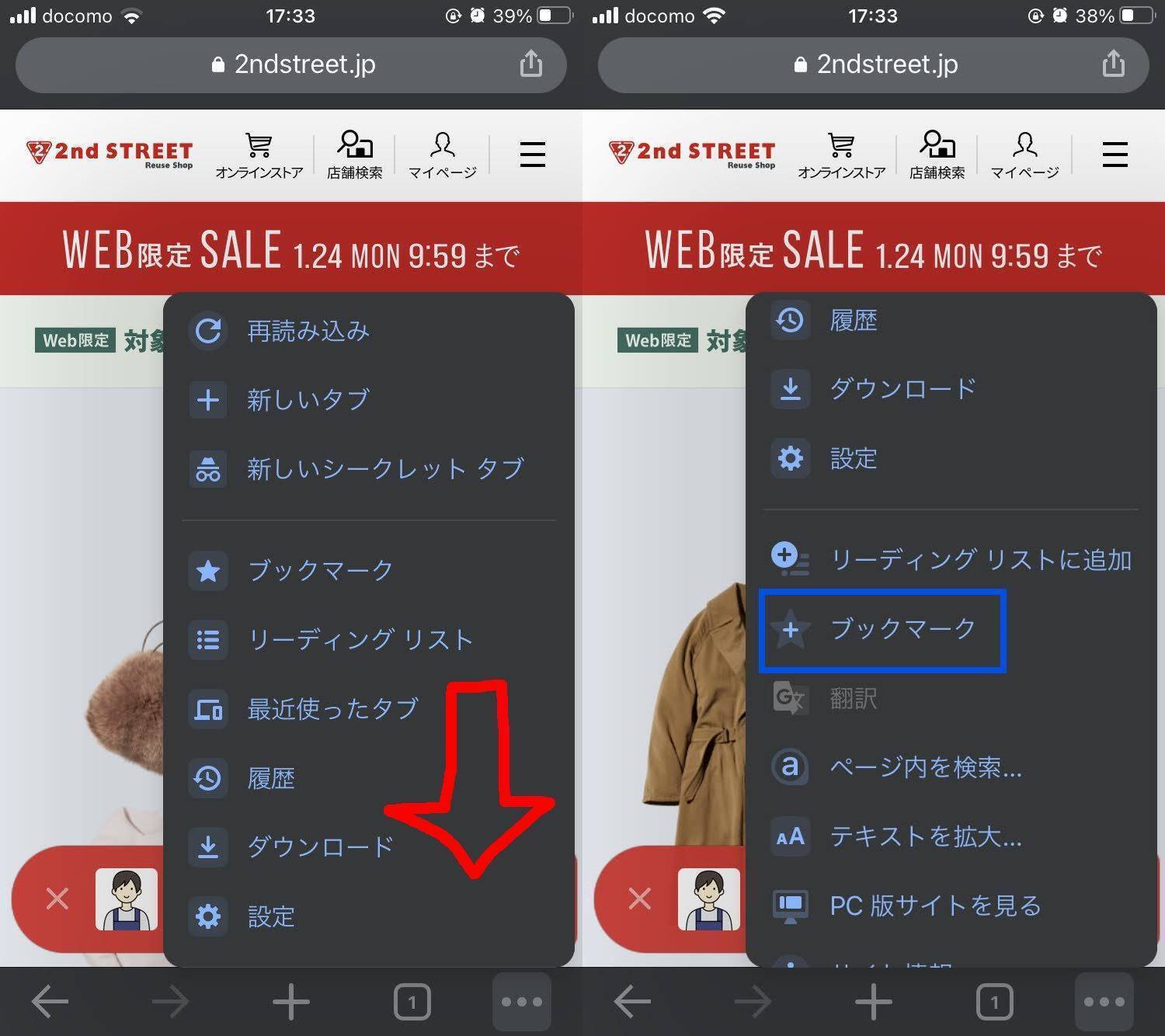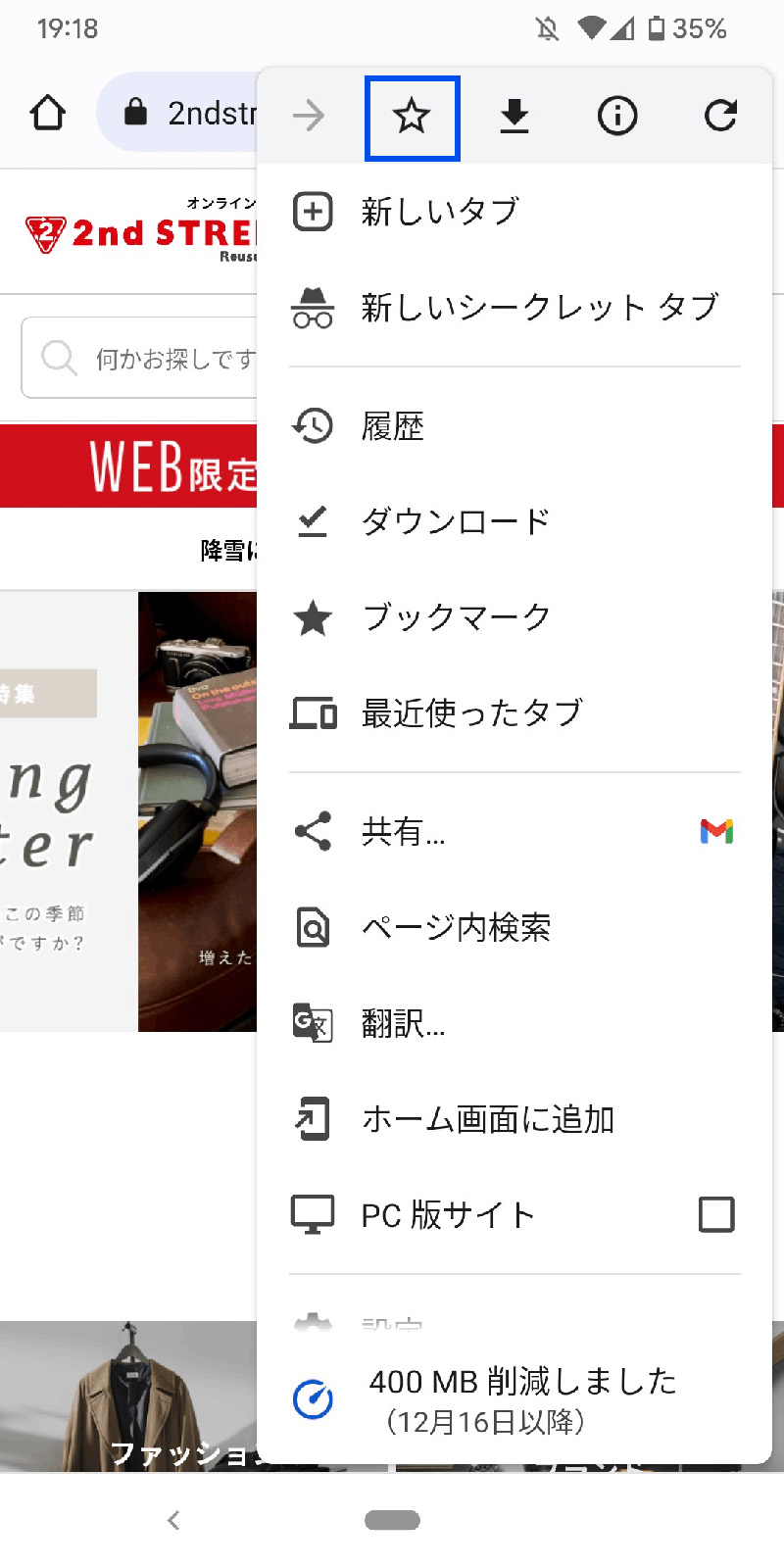 なんのサイトでもOKですが、わかり易いようにセカストを開きました。右上にある「︙」をタップして、ブラウザのメニューを出して下さい。