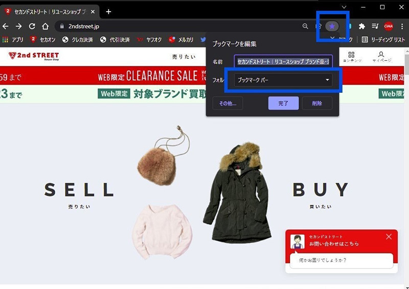 ブラウザのアドレスバー横にある「☆」をクリックしてブックマーク登録をしますが、「ブックマークバー」に保存して下さい。