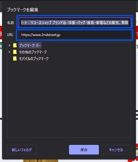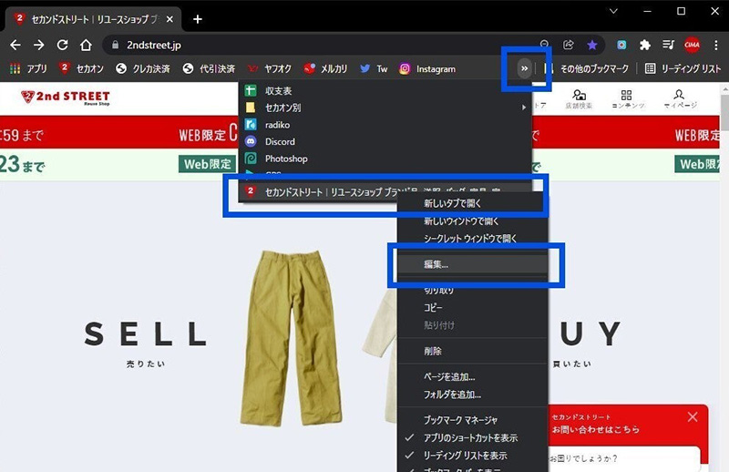下記のように保存したブックマークバーから、ブックマークを選択して編集をクリックします。