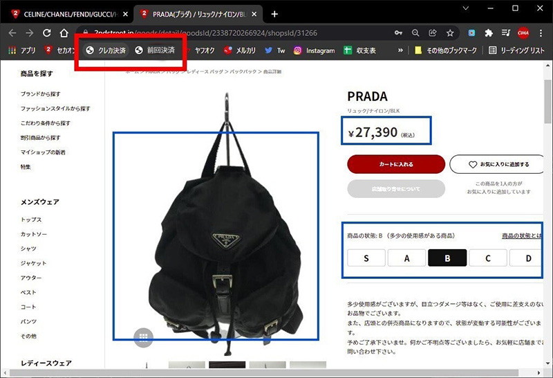 赤枠で囲った辺りに、自動購入ツールのボタンを移動させましょう。青枠で囲った、商品画像・金額・状態ランクを確認し、赤枠で囲った「クレカ決済」ボタンをクリックすると、ツールが起動され、購入完了まで自動で動きます。